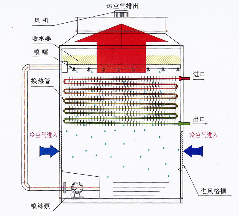 閉式冷卻塔內部結構圖和工作原理閉式冷卻塔工作原理:密閉式冷卻塔,簡稱閉式冷卻塔,(也叫蒸發(fā)式空冷器,封閉式冷卻塔)將管式換熱器置于塔內,通過流通的空氣、噴淋水與循環(huán)水的熱交換保證降溫效果。由于是閉式循